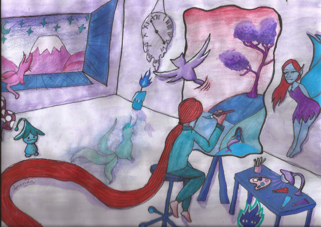 La artista sentada en su espacio, pintando un cuadro con árboles morados, mientras criaturas mágicas (el gato fantasma, el hada, la seta andante) interactúan a su alrededor.